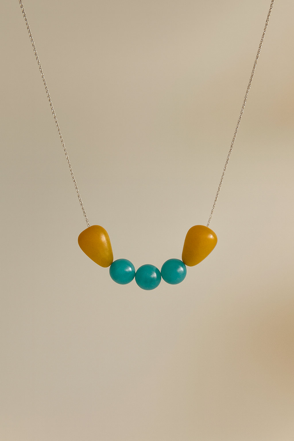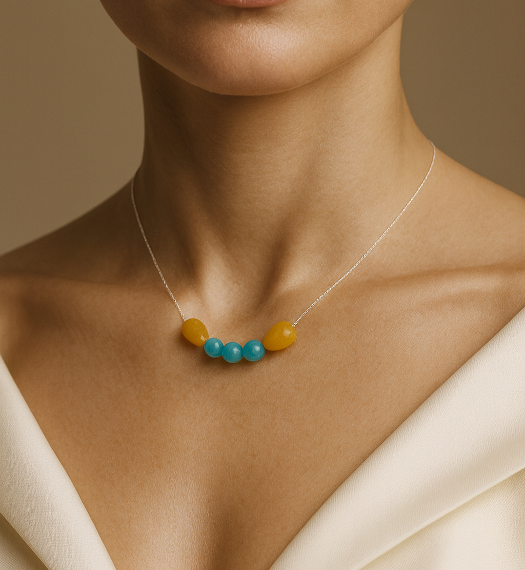 Un colier care aduce lumina caldă a verii aproape de piele. Creat din argint fin și jad în nuanțe de galben-miere și albastru intens, “Acord de Vară” surprinde întâlnirea dintre căldură și prospețime, două energii care se completează firesc.