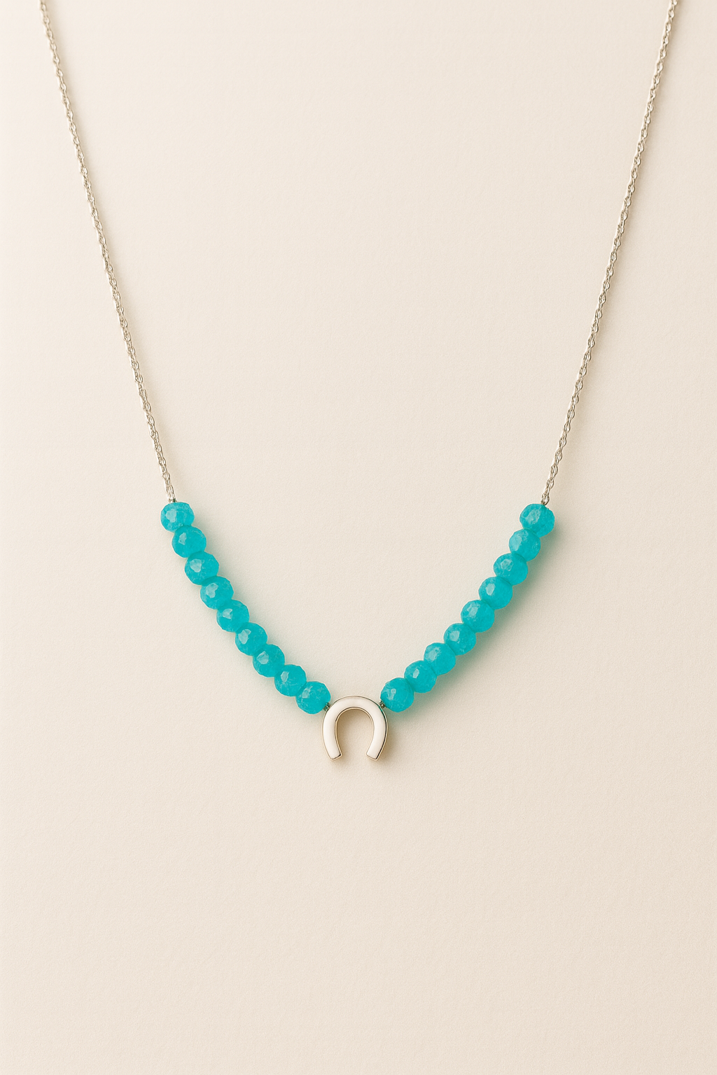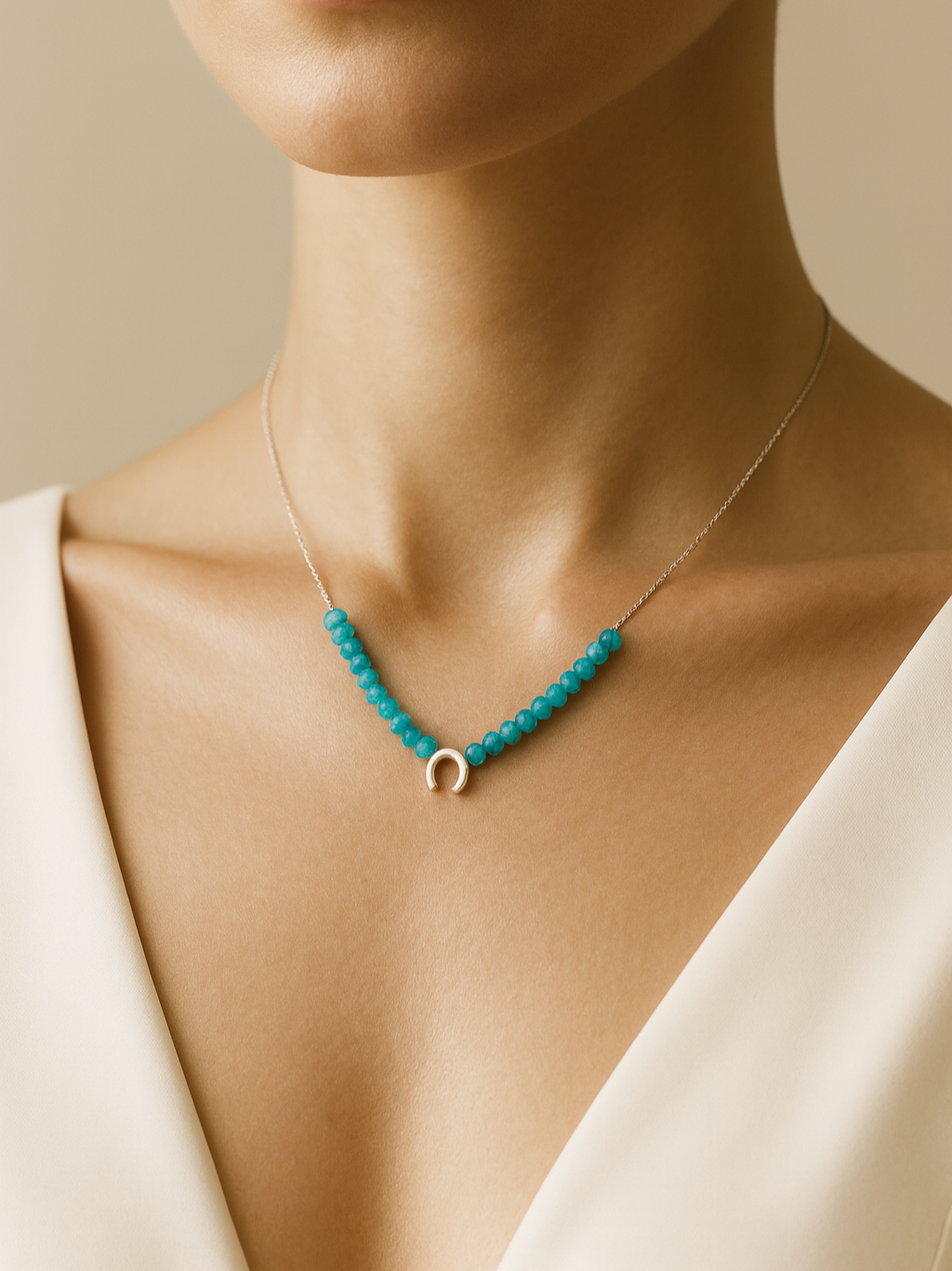 'Amuletă de Azur' este un colier delicat și luminos, creat din topaz bleu fațetat, ales pentru claritatea, prospețimea și vibrația sa calmă. Pietrele strălucesc discret la fiecare mișcare, iar în centrul compoziției se află o amuletă din argint 925, simbol al protecției și al norocului.