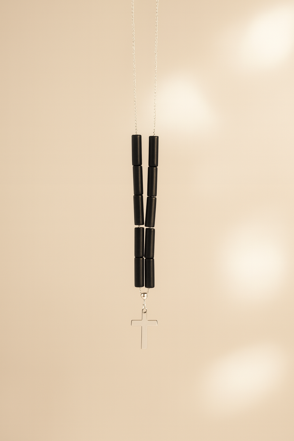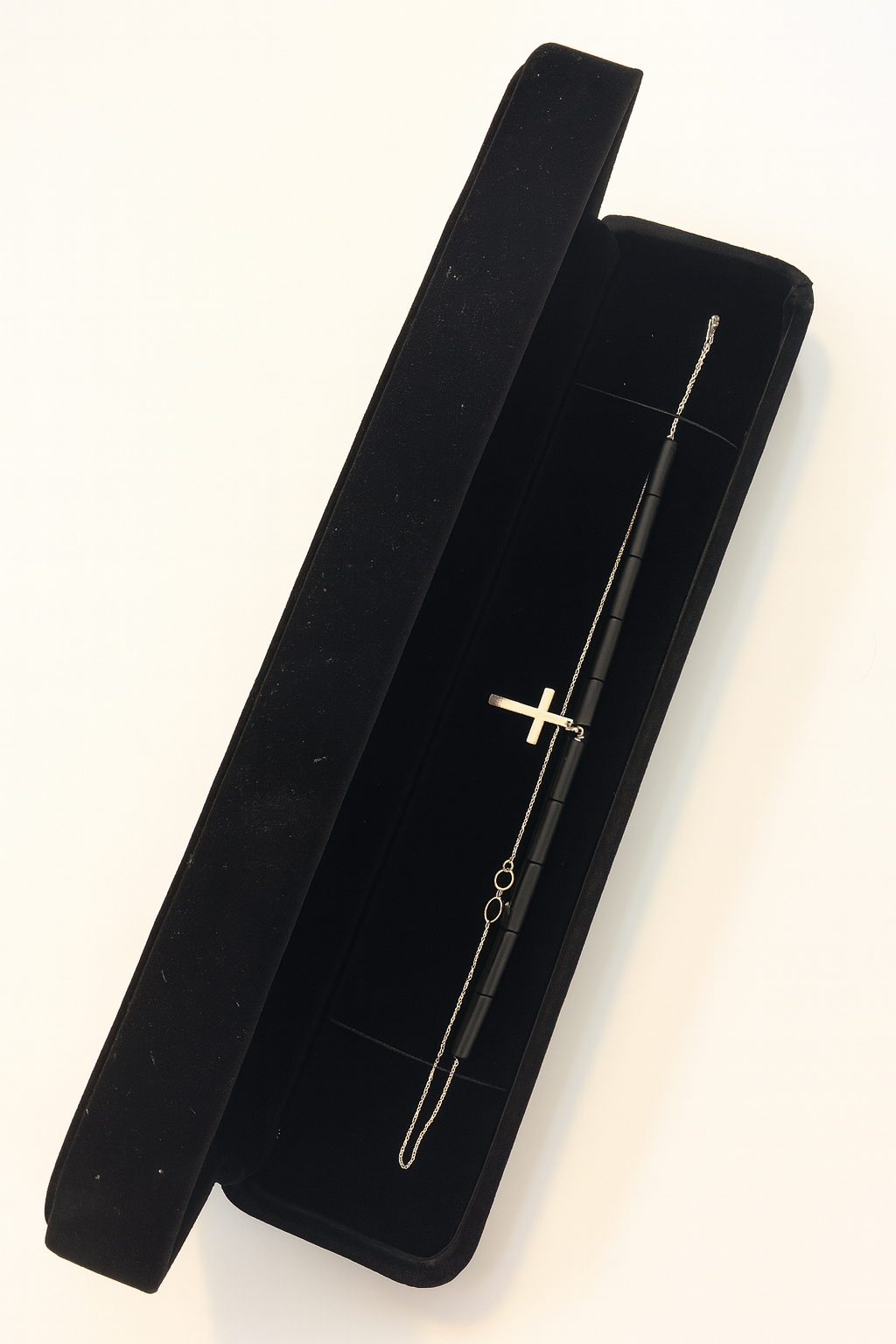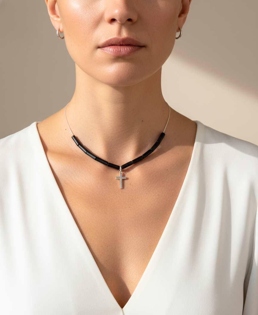 Pietrele de onix negru simbolizează stabilitatea și claritatea, iar crucea din argint adaugă o notă de puritate și protecție.