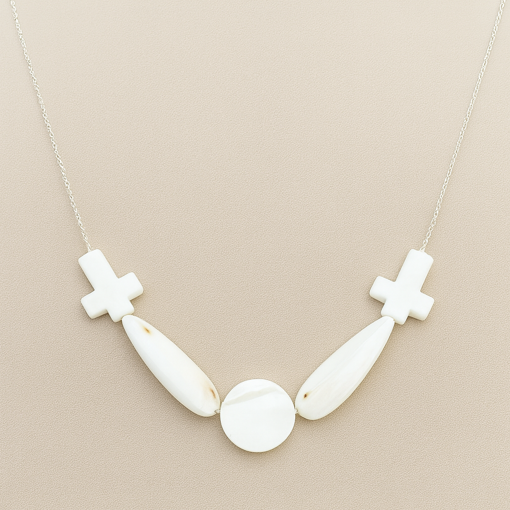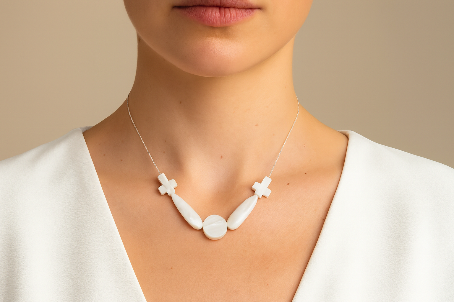 Formele organice de sidef natural, sculptate de mare și timp, se prind delicat pe un lanț fin din argint solid, creând un echilibru între simplitate și rafinament.
