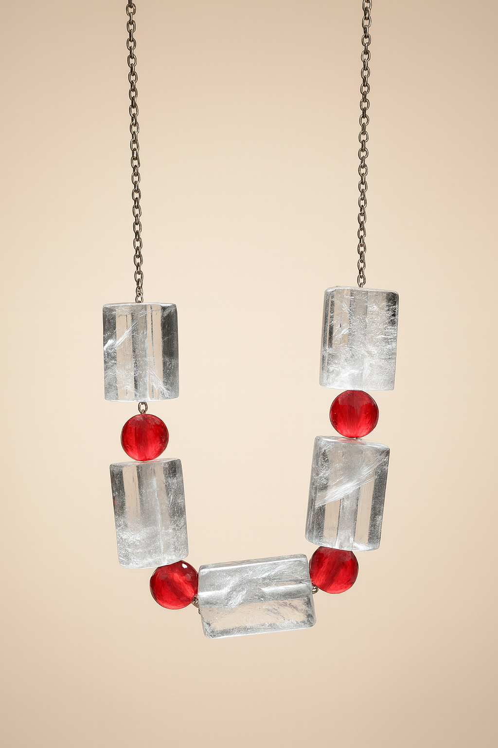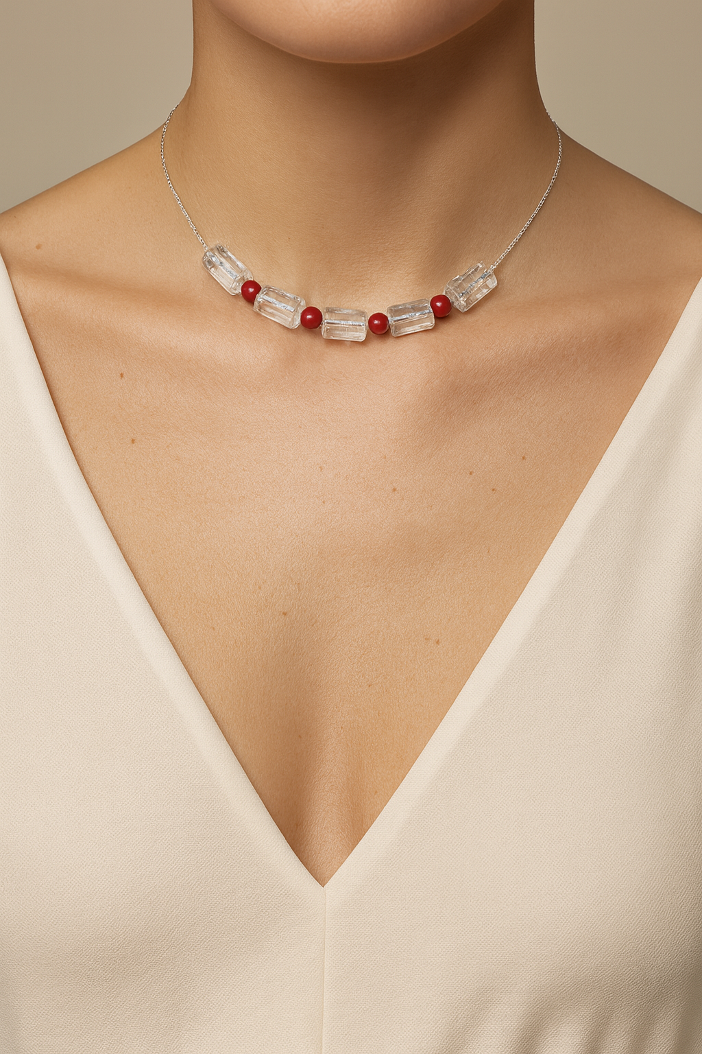 Pietrele de cristal de stâncă reflectă lumina în tonuri reci, aproape eterice, în timp ce accentele de jad roșu aduc viață și căldură, ca un foc ascuns sub suprafața liniștită a gheții.