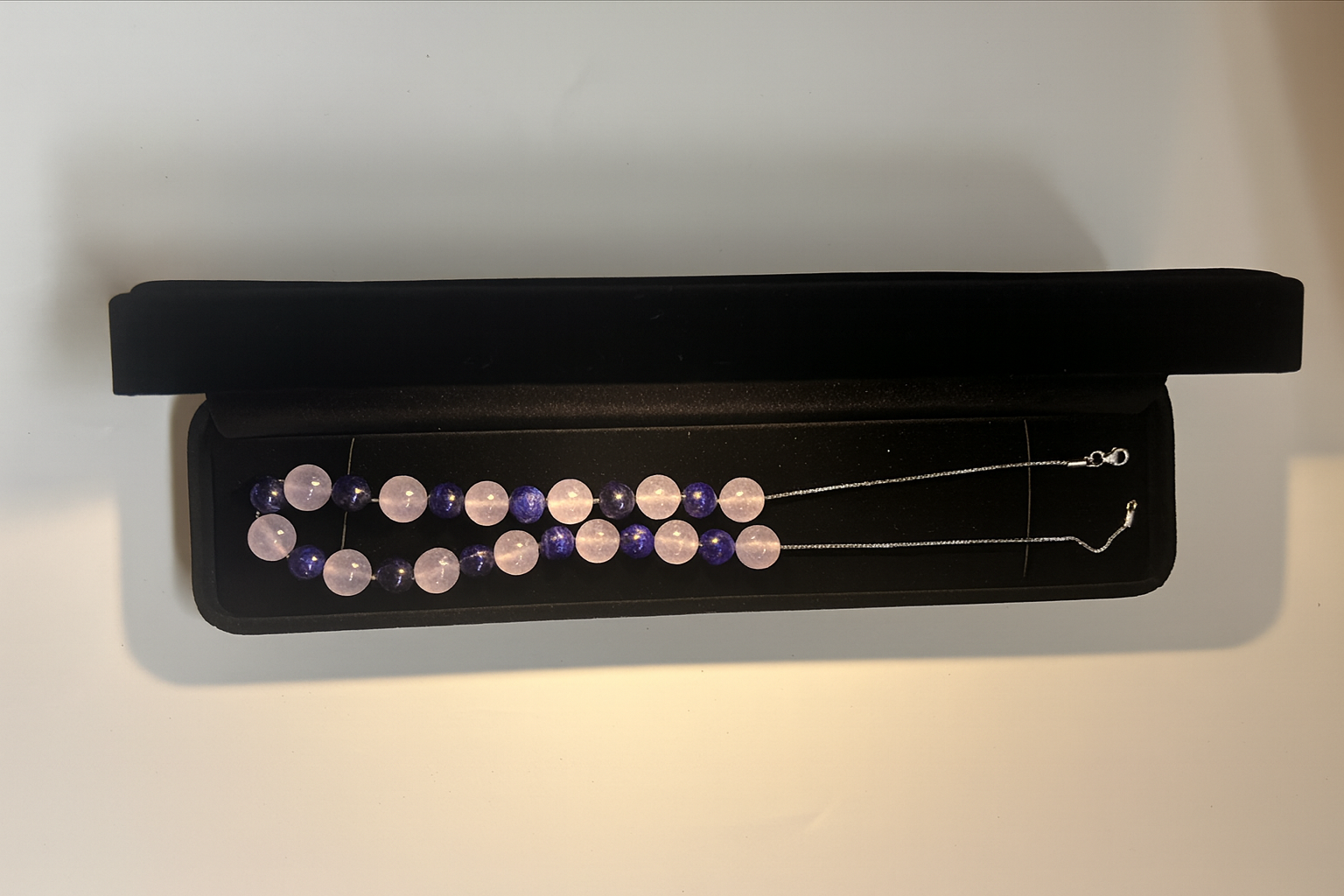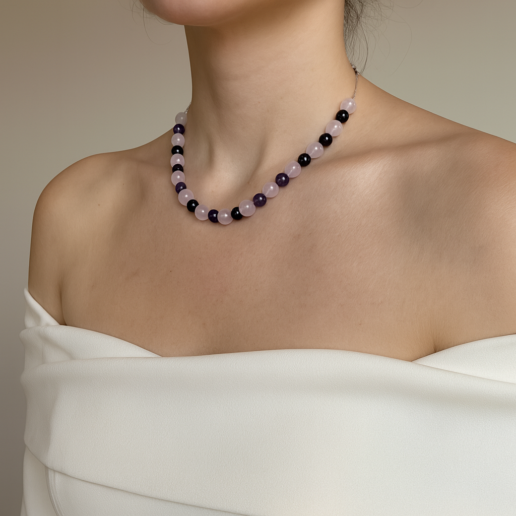 Pietrele de jad roz, delicate și pline de blândețe, se întâlnesc cu profunzimea misterioasă a ochiului de tigru, într-un dans al contrastelor care se completează perfect.
