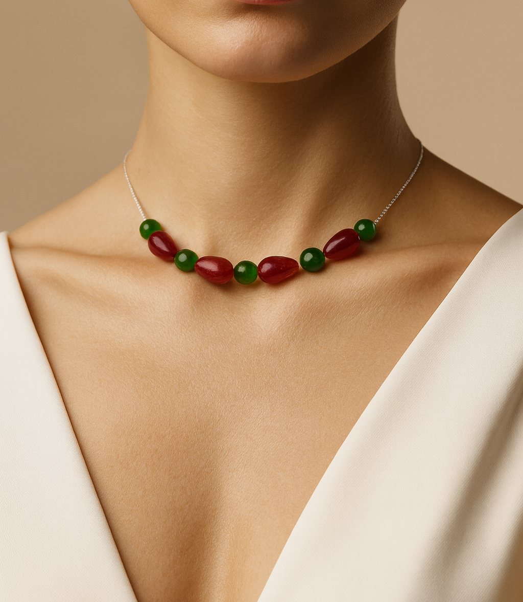 Fiecare element de jad este șlefuit manual pentru a-și păstra textura organică, iar lanțul fin din argint adaugă luminozitate și rafinament, lăsând culorile să devină centrul atenției.