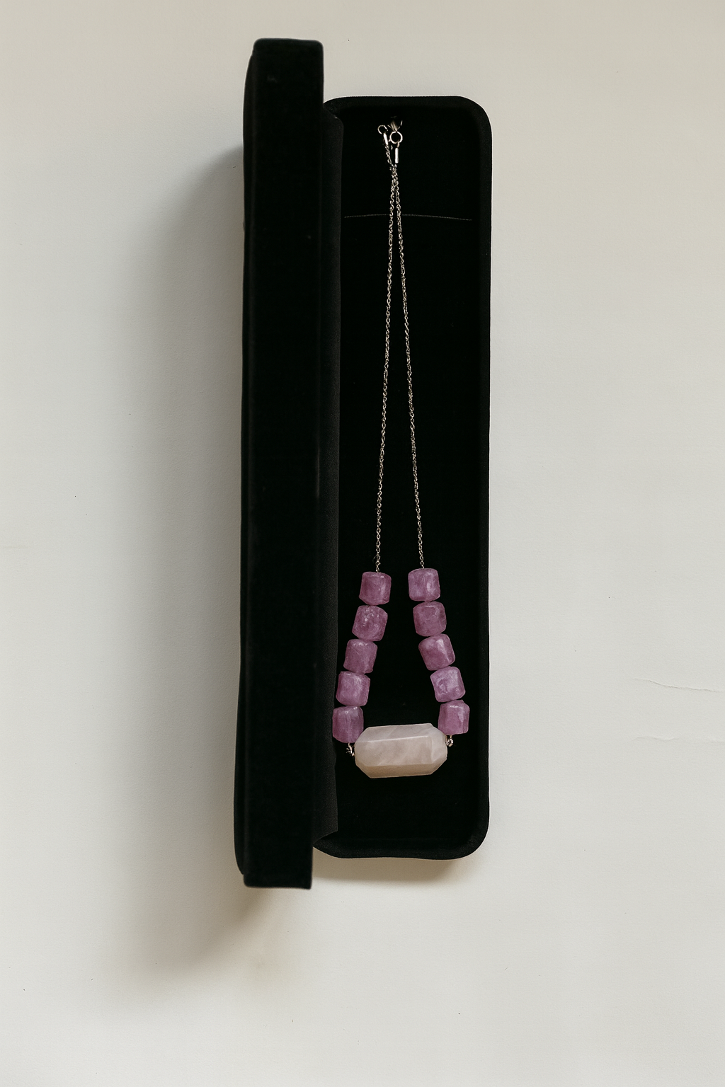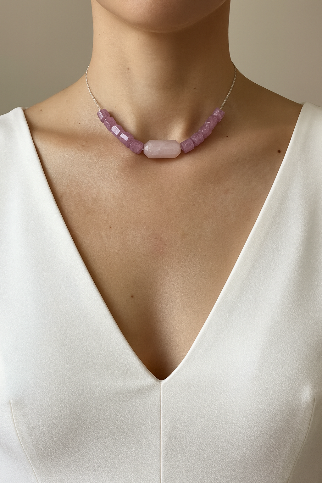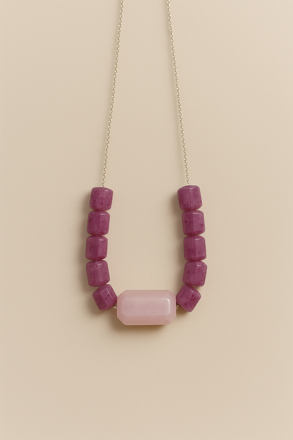 Pietrele de jad și cuarț roz, cu nuanțe catifelate și calde, sunt prinse pe un lanț fin din argint solid, creând o compoziție armonioasă, pură, aproape meditativă.