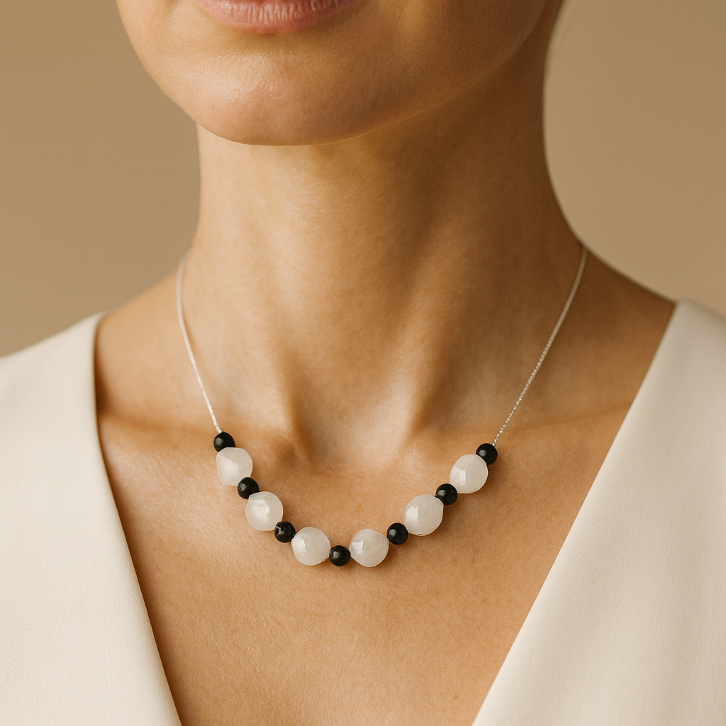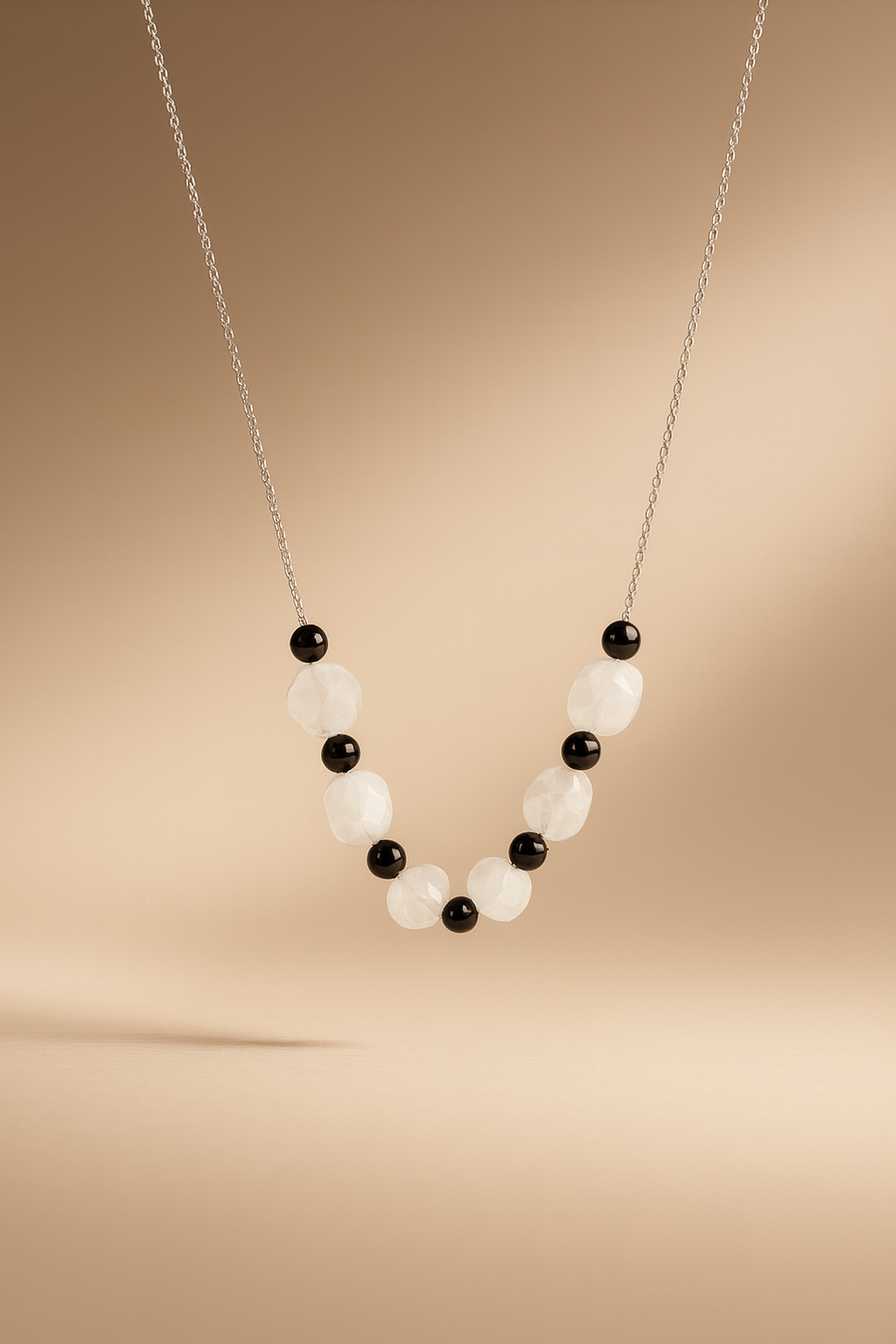Colierul „Sare și Piper” surprinde eleganța contrastelor într-o formă pură și modernă. Perlele de piatră a lunii, cu strălucirea lor lăptoasă și misterioasă, se împletesc armonios cu accentele profunde de obsidian, creând un ritm vizual echilibrat și sofisticat.