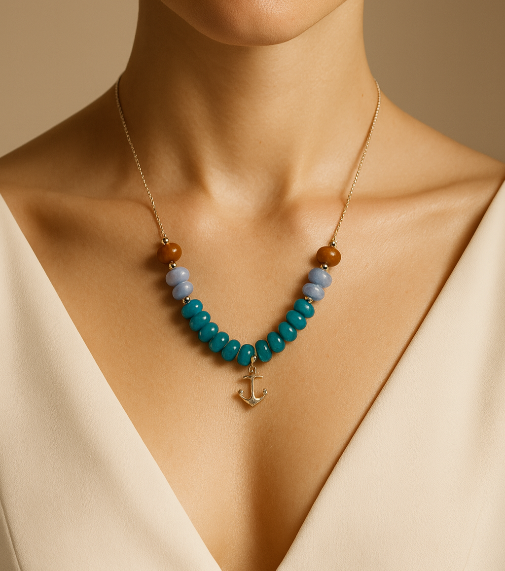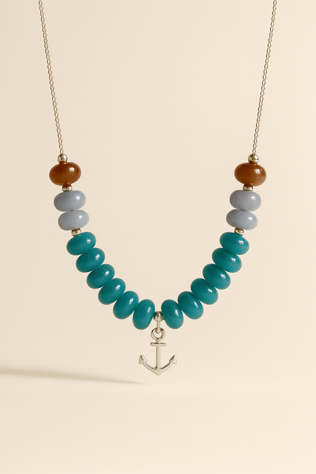 Creat din pietre de jad în nuanțe de albastru-verzui și finisat cu argint 925, colierul poartă simbolul unei ancore, semn al stabilității și al revenirii la sine.