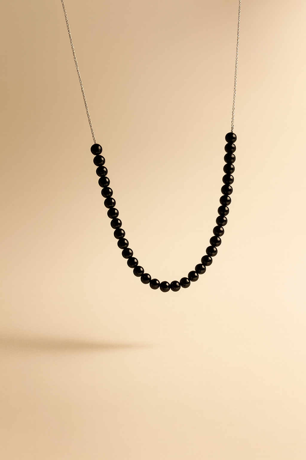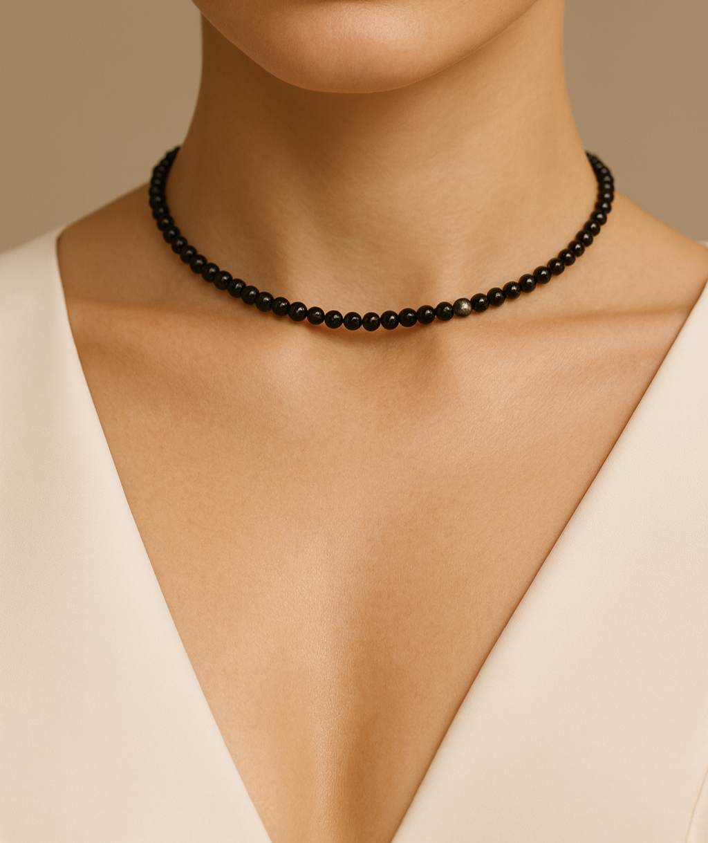 “Umbra Clară” este un colier în care eleganța discretă întâlnește forța profundă a obsidianului. Fiecare bilă perfect rotunjită, lucioasă și intensă, este așezată pe un lanț fin din argint, lăsând contrastul dintre lumină și întuneric să spună povestea.